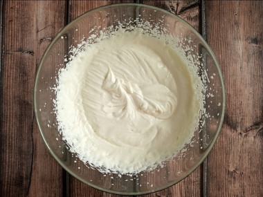 Холодную жирную сметану взбейте миксером с сахаром до пышности. Количество сахара можете регулировать по своему вкусу. О том, как правильно взбивать сметану для крема, читайте в статье в конце рецепта под шагами. Что делать, если у вас нет возможности приобрести жирную сметану? Можете взять сметану жирностью 20-25% и добавить в нее 8-9 г распущенного в 50 мл воды желатина. Тогда при застывании ваш крем хорошо схватится.