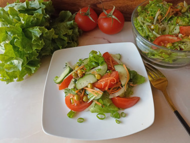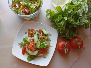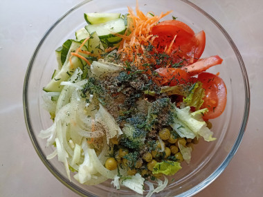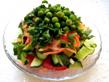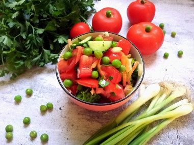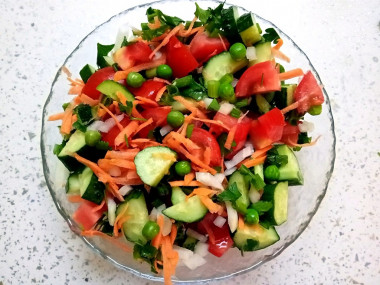 Увидела в ленте новый салат огурцы помидоры горошек зелёный, такие яркие фотографии пробуждают желание приготовить это красивое блюдо! К тому же здесь сплошные витамины. Обычно я режу овощи крупно, но в этот раз измельчила небольшими кусочками. Морковь натерла на крупной терке. Овощи все молодые, сочные, полезные) Горошек у меня был замороженный, я его залила кипятком и несколько минут проварила, затем обсушила. Листьев салата не нашлось. Зато добавила в салат петрушку для аромата и зеленый лук для небольшой остринки. Заправила овощной салат нерафинированным горчичным маслом. Красивый салат получился) После недолгого настаивали все кусочки пропитались заправкой и соками, очень вкусно. Подавала на ужин с отварной молодой картошкой.