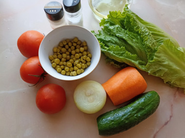 С горошка слейте жидкость. Морковку и лук очистите от кожуры. Листы салата тщательно вымойте, и обсушите. Какие листочки можно взять? Отлично подойдут романо, айсберг, лолло-росса, фриссе, корн и так далее. Огурцы и помидоры ополосните. Если у огурца грубая кожура, то её нужно срезать.