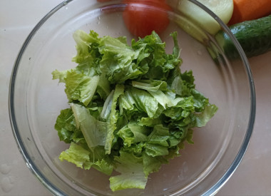 Листочки салата нарвите произвольными небольшими фрагментами. Отправьте в удобную глубокую салатницу.