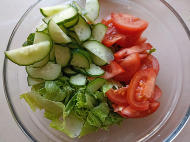 Помидоры и огурцы нарежьте кубиками среднего размера. Также допустимо овощи нарезать тонкими дольками. Сделайте так, как вам более привычно. Отправьте к листовому салату.