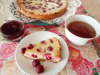 Нарезанные кусочки вишневого пирога из песочного теста в сметанной заливке разложите по тарелкам и подавайте к столу. Приятного аппетита!