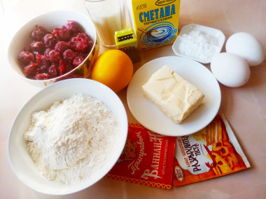 Как сделать заливной пирог тарт с песочным тестом, сметаной и вишней? Подготовьте продукты по списку. Вместо вишни можно взять черешню или любые ягоды на свой вкус. Сливочное масло выбирайте качественное. Его необходимо заранее достать из холодильника, чтобы оно стало мягким (часа за два). Вишню необходимо освободить от косточек. Количество сахара можно регулировать в зависимости от ваших вкусов и кислоты/сладости выбранных ягод.