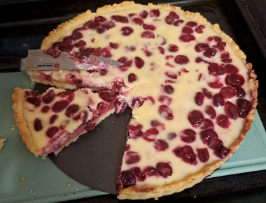 Пеку сегодня Вишневый пирог тарт с песочным тестом заливной и сметаной. Вишня у меня замороженная без косточек. вишни заранее выложила в сито, чтобы они разморозились и стек лишний сок. Тесто и заливку сделала по рецепту. При выпечке не стала насыпать поверх теста горох, не ожидала, что тоненькое донышко пирога настолько поднимется, в результате не вся заливка вместилась в пирог. Обязательно учту этот момент в следующий раз. Готовый пирог порадовал вкусом! Песочное тесто рассыпчатое, очень вкусное, заливка вообще замечательная- нежная, ванильно- сладкая, прекрасно сочетается с кисловатыми ягодами. Спасибо Сибирячке за рецепт. С удовольствием буду печь этот пирог ещё много раз.