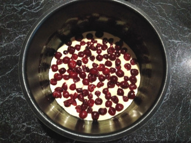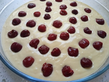 Выложите тесто на застеленный промасленным пергаментом противень или в форму для выпечки (диаметром 24-28 см). Если выпекаете пирог на противне, то пирог получится более тонкий и вишню можно просто выложить сверху. Если выпекаете в форме, то сначала выложите часть теста в форму и разровняйте. Сверху распределите половину ягод.