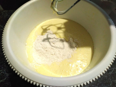 Яйца взбейте с сахаром в пышную воздушную пену. От того, как вы взобьете яйца, зависит воздушность вашего пирога. Нельзя взбивать массу прямо добела и до плотности - белок утратит воздушные пузырьки, которые поднимают тесто. И в таком случае не поможет даже сода. Тесто либо не поднимется совсем, либо поднимется очень слабо.