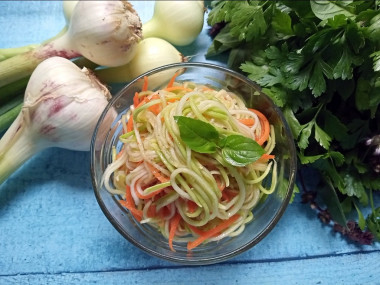 Сделала салат с соевым соусом и овощами. Обычно так я готовлю морковь по-корейски, а добавление кабачка придает салату дополнительную сочность . Очень вкусный салат с идеальным набором специй и потрясающим ароматом. Спасибо за рецепт, Аля Жемчужинка!
