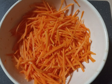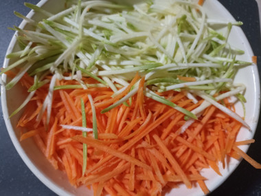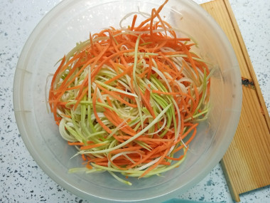 Морковку и кабачок натрите на тёрке для корейских салатов. Так же овощи допустимо нарезать от руки острым ножом на тонкие длинные полоски. Отправьте в глубокую, подходящую по размеру чашу.
