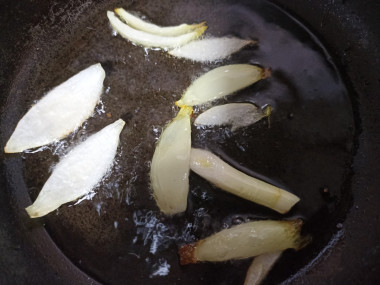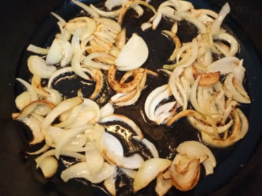 Лук нарежьте крупными кубиками. В сковороде с толстым дном разогрейте растительное масло. Отправьте лук обжариваться. Помешивая, оставьте до появления тёмно-золотого оттенка. С помощью ложки выньте обжаренный лук из сковородки.