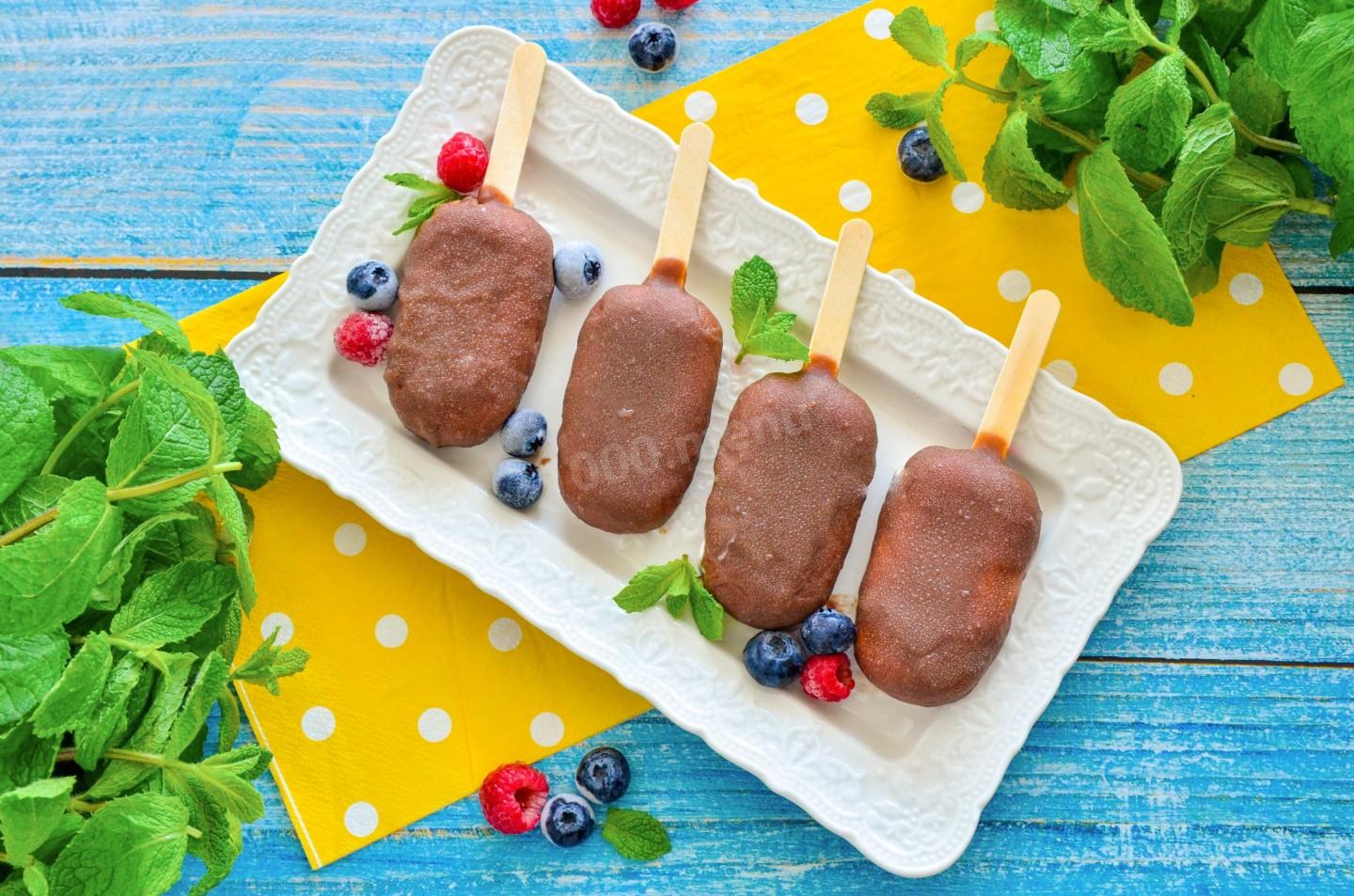 Домашнее эскимо подают прямо из морозилки. Выложите на тарелку или подставку, можно украсить ягодами, мятой, посыпать орешками или кокосовой стружкой. Особенно эффектно смотрится на детском празднике. Подавайте с горячим шоколадом или кофе — контраст температур потрясающий.