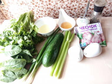 Как сделать салат из щавеля свежего с луком? Подготовьте все продукты, которые указаны в списке. Количество зелени и огурцов можно подкорректировать по собственному вкусу. Листы салата, щавель, молодой (как у меня) или зеленый лук, стебель сельдерея, огурец тщательно ополосните.