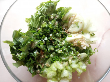 Салат хорошо перемешайте, чтобы заправка равномерно распределилась по всем компонентам. Готово!