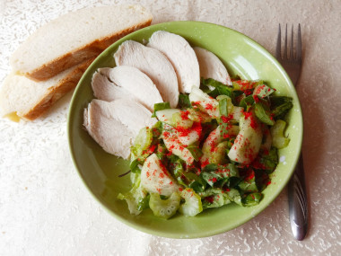 Я обычно такой салатик подаю к рыбе или к курице. Он лёгкий и прекрасно сочетается с ними. Так же иногда салат предлагаю в качестве самостоятельного перекуса. Особо это актуально в жаркие дни.