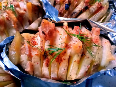 На ужин решила запечь картошку с беконом в фольге. Тем более вся моя семья любит картошку-гармошку. Бекон у меня был варено-копченый цельным куском. Я его нарезала на небольшие кусочки. Картошку взяла молодую, не стала ее чистить, просто хорошо промыла от грязи. Надрезы делала с помощью палочек для суши, это удобно. Кроме соли и чеснока добавила немного копченой паприки, она придаёт приятный аромат. Клубни у меня были крупными, поэтому запекались примерно час. И ещё немного под грилем) Картошка просто супер! Все пластиночки пропитаись соком бекона и стали сочными, вкусными, ароматными, соли как раз в меру. Это полноценный питательный ужин, остаётся только добавить салат из свежих овощей.