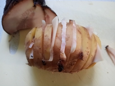 В каждый разрез в картошке вставьте ломтики бекона.