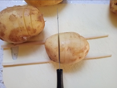Картофель очистите и обсушите бумажными полотенцами. Каждый клубень положите в столовую ложку или между двумя палочками для суши и сделайте ножом частые глубокие надрезы, не доходя до конца клубня.