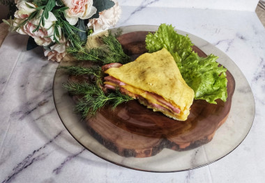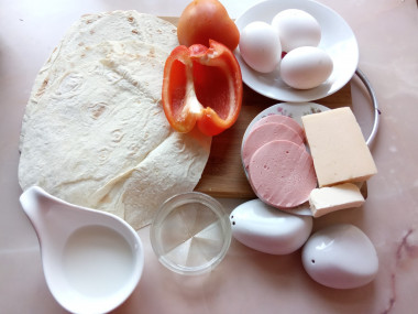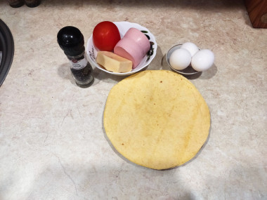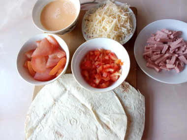 Быстрый завтрак из лаваша на сковороде - отличный вариант вкусного начала дня. И готовится совсем несложно. Я брала три лепешки тонкие вместо лаваша и варёную колбасу вместо ветчины и не использовала перец болгарский,т.к. сын не любит его. Помидоры мелко порезала, сыр натерла на мелкой тёрке, колбасу порезала ломтиками небольшими. Яйца смешала с молоком, добавила соль,перец и слегка взбила. На разогретую сковороду вылила немного яичной смеси,затем лепешку. На лепешку выложила колбасу, помидоры,сыр. Затем накрыла второй лепёшкой и повторила начинку. Сверху добавила третью лепешку и вылила оставшуюся яичную смесь. Накрыла крышкой и обжарила. Затем перевернула и обжарила с другой стороны.