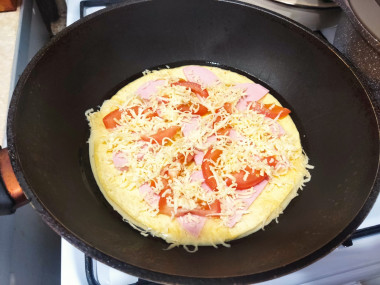 Выложите на него также сверху ветчину, помидор и перец, посыпьте сыром. Накройте третьим лавашем. Прижмите ладонью. Залейте все остатками омлетной массы.