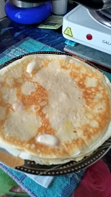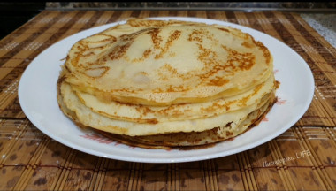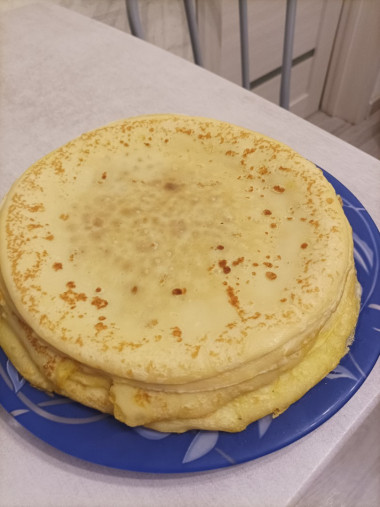 Продуктов взяла больше, на 1 л молока. Получились не тонкие, но это я так выпекала. Вкусные! Получилось много, половину слопали сразу!