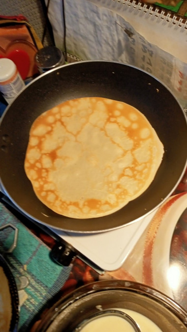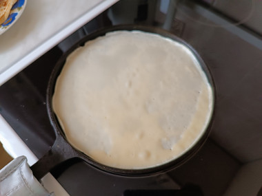 Это потому что яиц много в тесте) Результат — тончайшие блины.