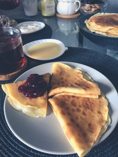 Лучшее начало выходного дня- это вкусный завтрак! А самый вкусный завтрак- это тонкие теплые блинчики с вареньем, сгущенкой и сметаной. Рецепт замечательный! Блинчики получаются очень нежными,тонкими и вкусными.