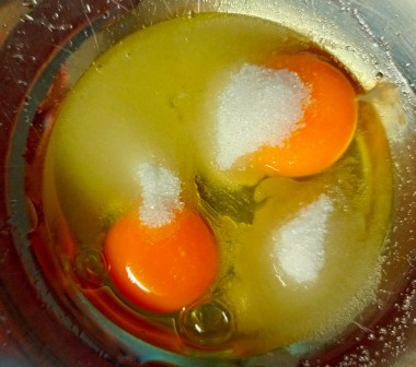 Обязательно мойте яйца перед использованием, так как даже на кажущейся чистой скорлупе могут находиться вредные бактерии. Лучше всего использовать моющие средства для пищевых продуктов и щетку. Хорошо помытые и обсушенные яйца вбейте в глубокую миску. Добавьте к яйцам сахар и соль. Их количество регулируйте по своему вкусу, сахар, как по мне, можно уменьшить.