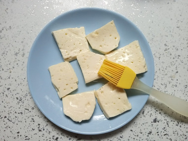 Смажьте ломтики сыра со всех сторон растительным маслом. Если собираетесь жарить сыр на обычной сковороде, можете дополнительно обвалять сыр со всех сторон в кукурузном или картофельном крахмале или в муке. Обязательно стряхните излишки крахмала, чтобы он не подгорел на сковороде. Я жарила сыр на сковороде гриль, поэтому никакой панировки не делала.