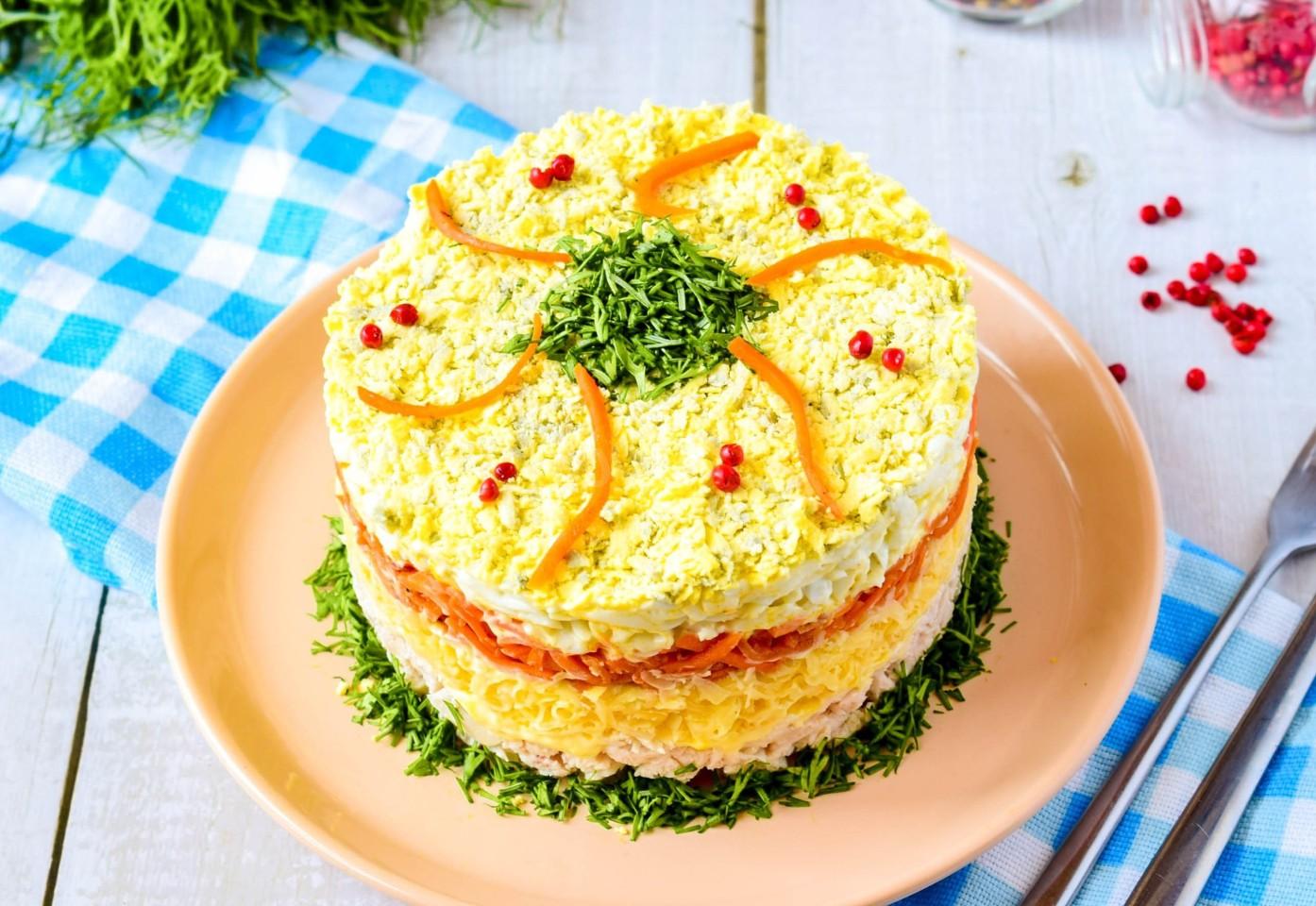 Корейская морковь в этом салате играет роль не только овоща, но и готового маринада, пропитывающего соседние слои.