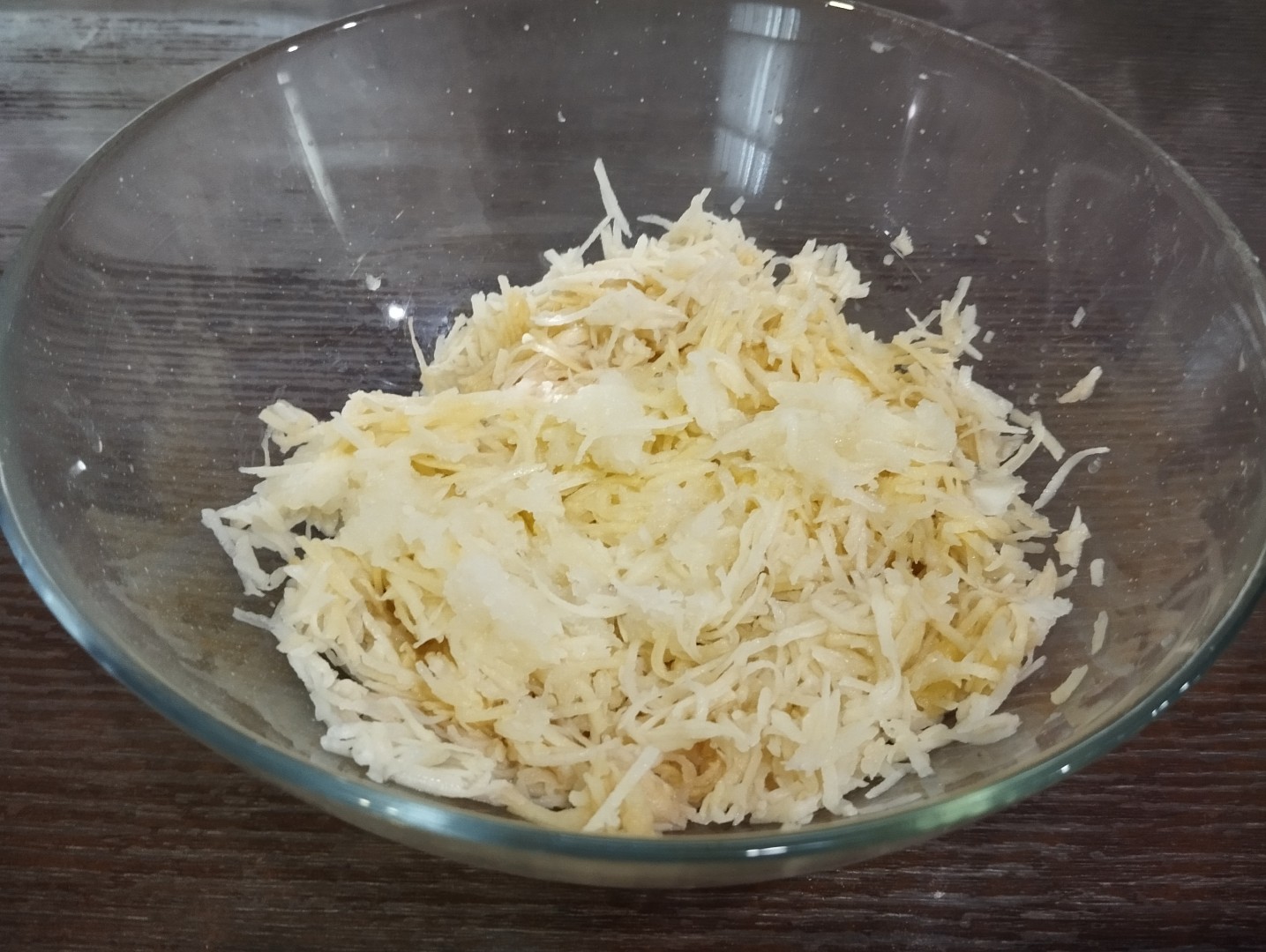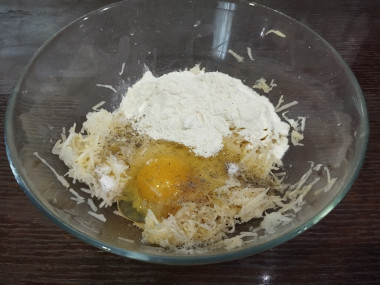 Тёрла картошку я на самой мелкой тёрке, лук тоже. Добавила взбитое вилкой яйцо, соль.