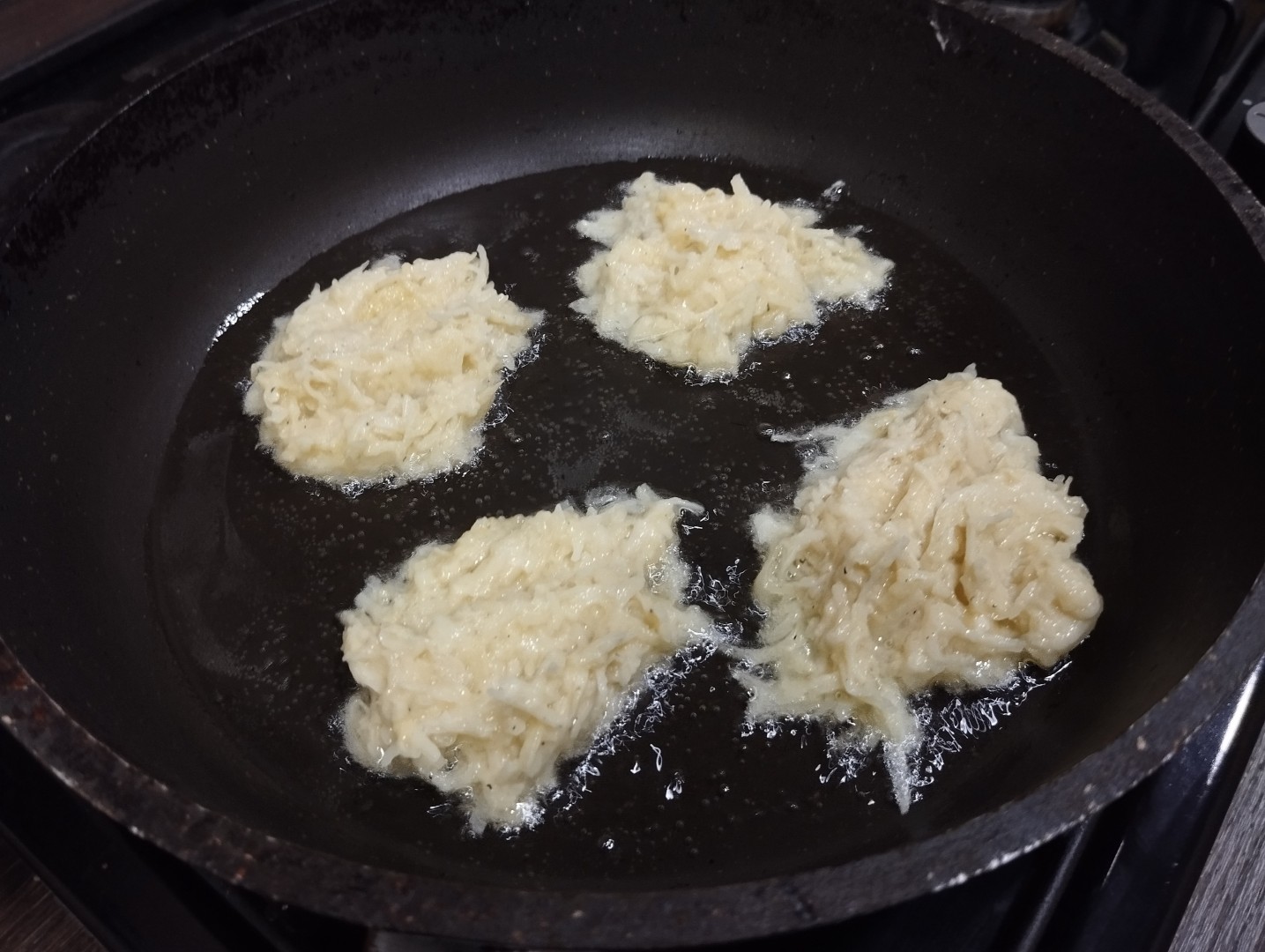 Разогрейте на сильном огне сковороду с толстым дном. Налейте растительное масло. Выложите ложкой тесто в разогретое масло, формируя круглые оладушки-драники. Сильно толстыми их не делайте, чтобы картофель хорошо прожарился.