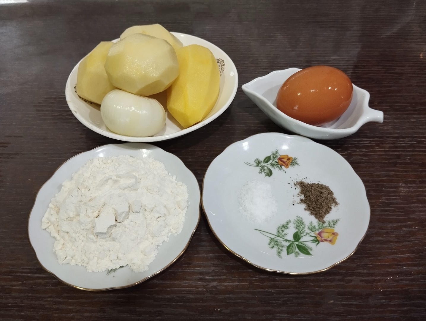 Калорийность продуктов: Картошка, Лук репчатый, Яйца, Пшеничная мука, Перец черный молотый, Соль, Растительное масло