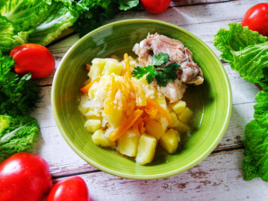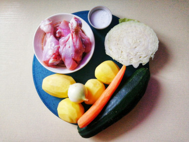 Куриные ножки я разрезала на части, обжарила в мультиварке на растительном масле в течение 8 минут. Затем добавила лук и морковь, оставила жариться вместе с курицей на 5 минут. После этого положила в мультиварку кабачок, капусту и картошку, налила немного воды, посолила и, переключив режим на "тушение", оставила на 40 минут.