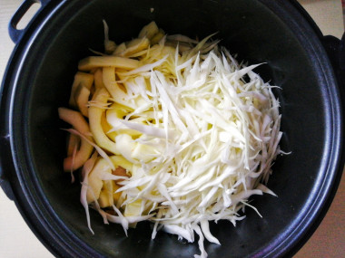 Затем выложите в чашу капусту и кабачки. Добавьте картофель, нарезанный кусочками.