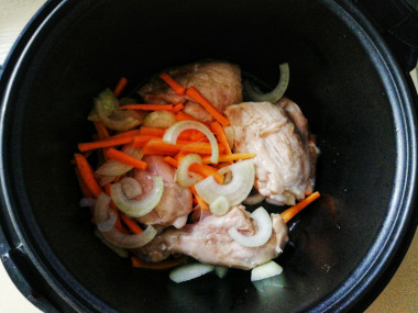 В чашу мультиварки к курице выложите лук и морковь. Перемешайте и обжаривайте все вместе еще минут 5.