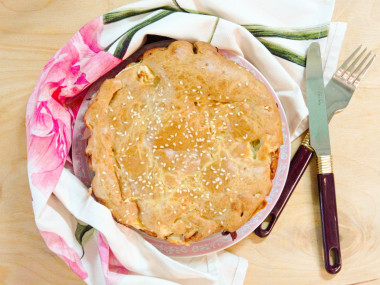 Залейте по капусте вторую половину теста и посыпьте верх будущего пирога кунжутом. Поставьте форму в духовку, предварительно разогретую до 180 градусов, минут на 40. При выпекании ориентируйтесь по своей духовке.