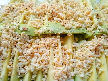 В форму для запекания выложите кабачки, как на фото. Сверху сбрызните оливковым или растительным маслом. Посолите при необходимости по вкусу. Я обычно соль не добавляю, так как сыр солоноватый сам по себе. Посыпьте сверху ровным слоем сыра с приправами и чесноком. С выбором формы и масла для запекания вам помогут статьи под рецептом.