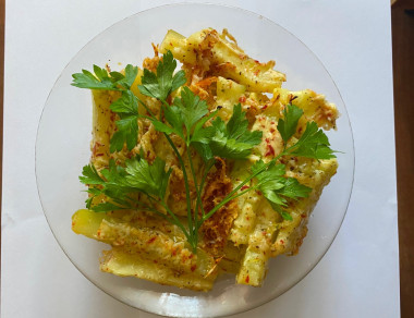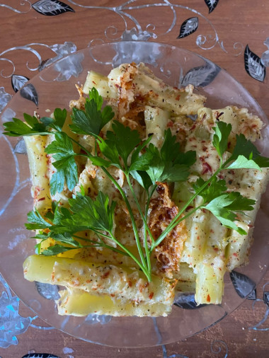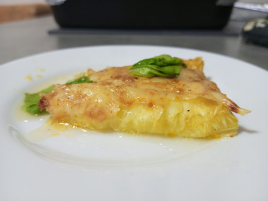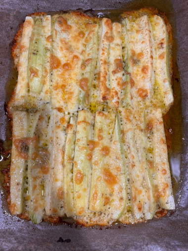 На вид - красиво и на вкус - отлично! Больше понравилось чем в рецептах, где на кругляши надо резать. Сыр использовал - Моцарелла, приправы: соль, чёрный перец, паприка, свежий чеснок. Т.к. духовой шкаф электрический, первые минут 15 делал под фольгой, иначе слишком рано зарумянится и вообще подгореть может, а внутри будет ещё не готово.
