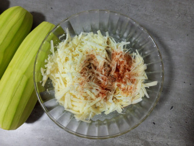 Итак, сыр натрите на тёрке со средними или мелкими зубками. Чеснок очистите, промойте, обсушите и пропустите через пресс. Смешайте тёртый сыр и измельчённый чеснок. Так будет удобнее распределять сыр и чеснок на поверхности кабачков. Я чаще для рецепта использую чесночный порошок, он равномерно смешивается с тёртым сыром и готовить в дальнейшем в разы удобнее.