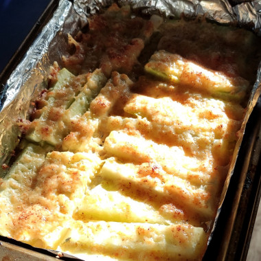 Я очень обрадовалась появлению нового рецепта кабачков в духовке с сыром и чесноком. Люблю такие простые ПП рецепты, усилий минимум, а в результате получается очень вкусно. Ещё мне понравилось, что кабачки не развалились, остались немного хрустящими и отлично держали форму. Сверху я посыпала не твёрдым сыром, а рассольной брынзой. Смешала её с чесноком и сушеным базиликом. Кабачки не стала солить, т. к. брынза была достаточно солёной. Запекала также 20 минут и 5 минут под грилем. Получилась красивая румяная корочка. Кабачки вкусные, пряные и лёгкие, на ужин и перекус подошли отлично!