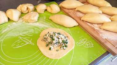 На каждый кусочек теста выложите по 1-2 столовой ложки начинки.