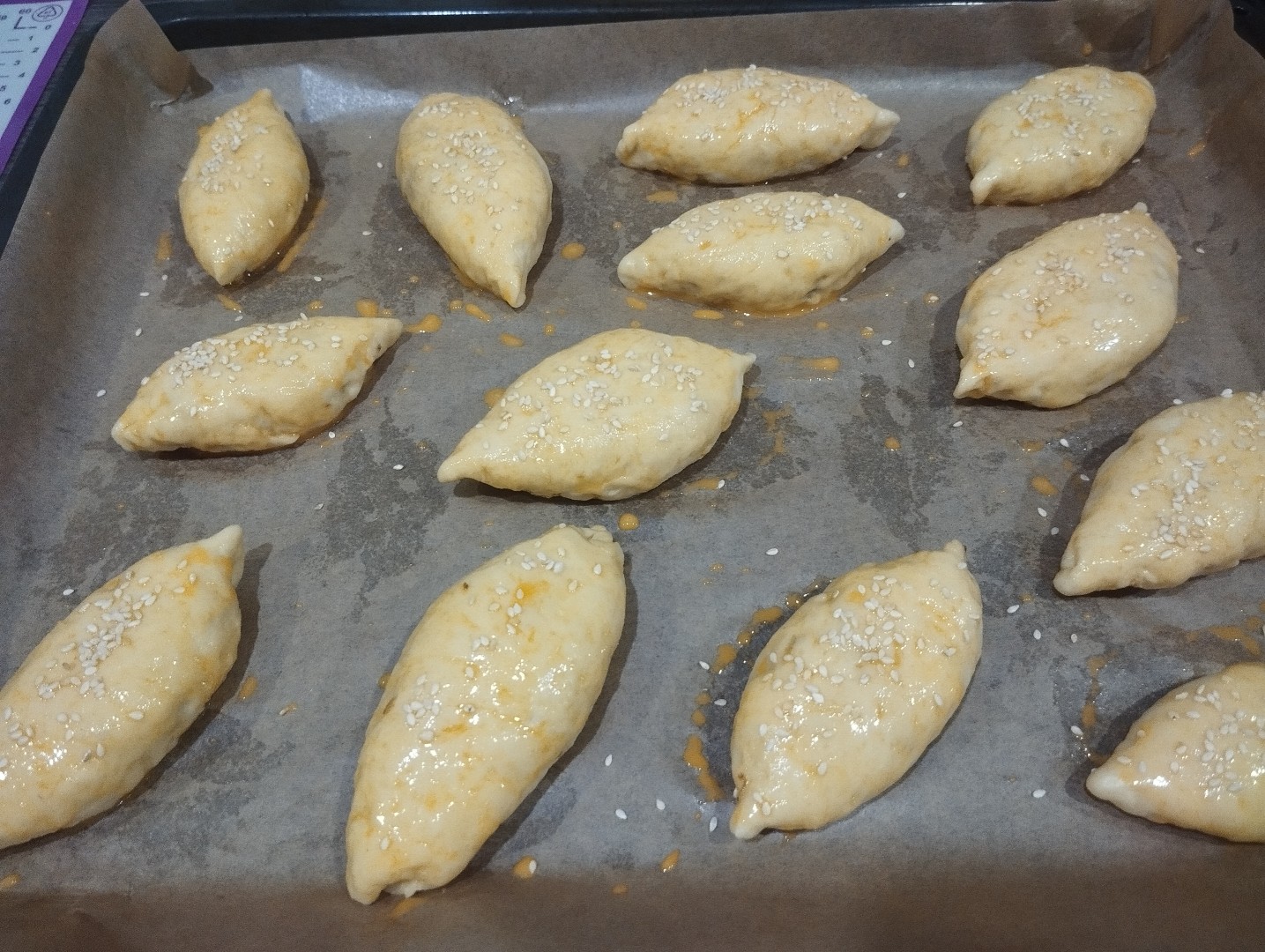 Выложите пирожки на застеленный пергаментом противень швом вниз. Оставьте их так для расстойки на 10 минут.