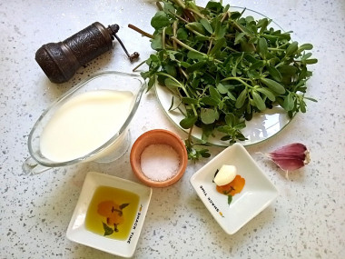 Как сделать простой ПП салат с йогуртом? Подготовьте все продукты, которые указаны в рецепте. Возьмите небольшой пучок любой зелени или салатных листьев. Это могут быть шпинат, китайская капуста, щавель или что-то другое. У меня портулак. Если берете его тоже, выберите молодые стебельки без цветов. Салат можно готовить из стеблей и листов, либо использовать только листочки.