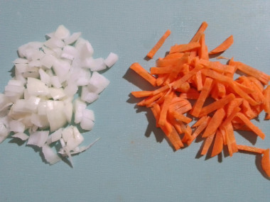 Лук и морковь вымойте, очистите и нарежьте некрупными кубиками. Желающие могут натереть морковь на средней или крупной терке.