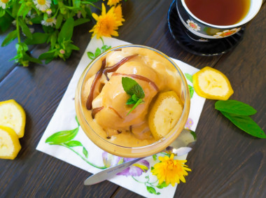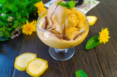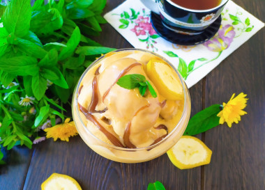 Готовое мороженое разложите по креманкам. Полейте сверху жидкой вареной сгущенкой или карамельным соусом, украсьте мятой и подайте к столу. Приятного аппетита!