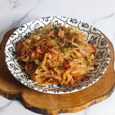 У капусты снимите верхние поврежденные листья, удалите кочерыжку. Капусту нашинкуйте. Чтобы сделать блюдо сытнее, можете добавить к капусте нарезанный кубиками картофель.