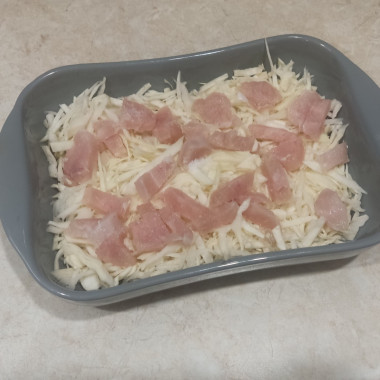 В форму для запекания (у меня диаметр формы 27 см) выложите капусту и разровняйте. Смазывать форму ничем не нужно - из мяса и капусты выделится много сока, который не даст ингредиентам прилипнуть к форме.