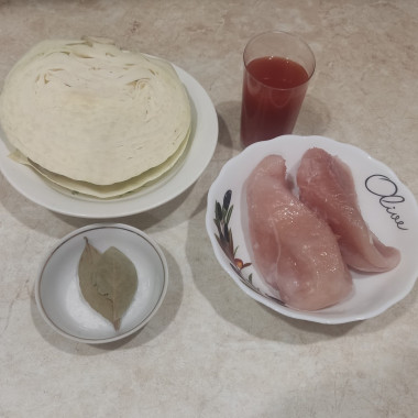 Залейте капусту с мясом томатным соком комнатной температуры. Сверху разложите лавровые листья.