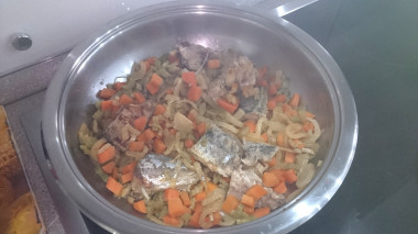 В сковороду на овощную смесь выложите нарезанную скумбрию. Тушите на медленном огне под крышкой 20-25 минут. Через 10-12 минут от начала тушения переверните рыбу на другую сторону.