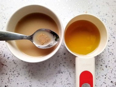 Приготовьте маринад. В глубокую мисочку сложите горчицу, сахар и соль. Перемешайте. Небольшими порциями вливайте растительное масло, активно перемешивая массу — если влить все масло сразу, маринад расслоится. Затем добавьте 9% уксус. Перемешайте до однородности.