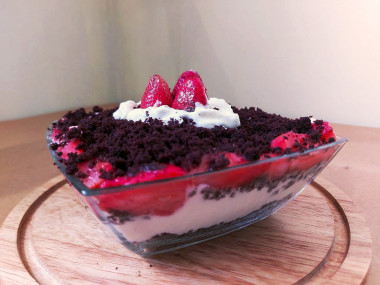 На дно стаканов выложите кружок бисквитного коржа. Сверху распределите часть клубники. На ягоды распределите часть сливок. Накройте вторым шоколадным коржом и повторите слои. Сверху посыпьте бисквитной крошкой. Поставьте десерт на 1-2 часа в холодильник для пропитки.